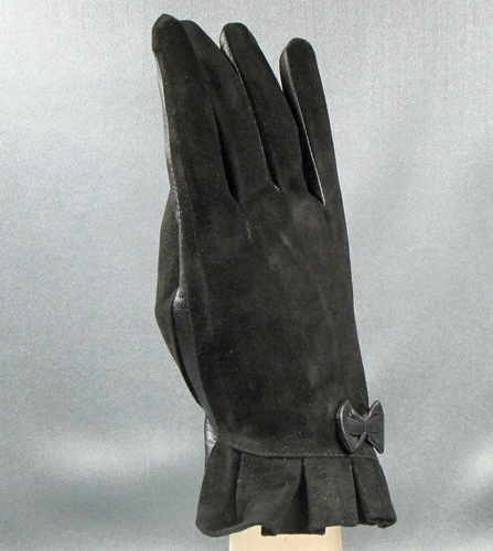Перчатки выполнены из натуральной кожи черного цвета. Швы - внутренние машинные. Отделка - комбинирование с замшей на наружной стороне, манжет выполнен в виде оборки с наружной стороны. Длина манжеты от нижней точки большого пальца до края перчаток - 3,5см